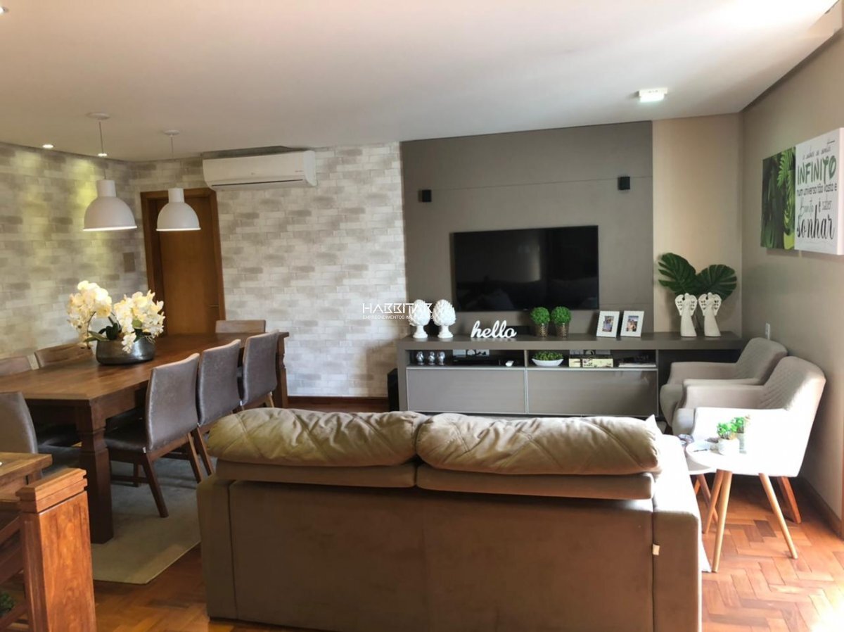 No primeiro pavimento, uma suíte master com closet, mais dois dormitórios, sala de estar, cozinha, lavanderia, sacada fechada. Segundo pavimento, sacada com vista, espaço gourmet com churrasqueira, sala de televisão, sala de jantar, banheiro social completo e um dormitório. Ficam somente os móveis sob medida e ar condicionados split. Duas vagas de garagem. Próximo a creche, supermercados, bancos e comércios.