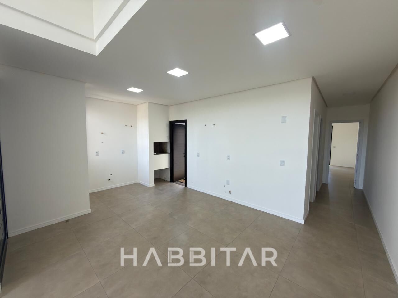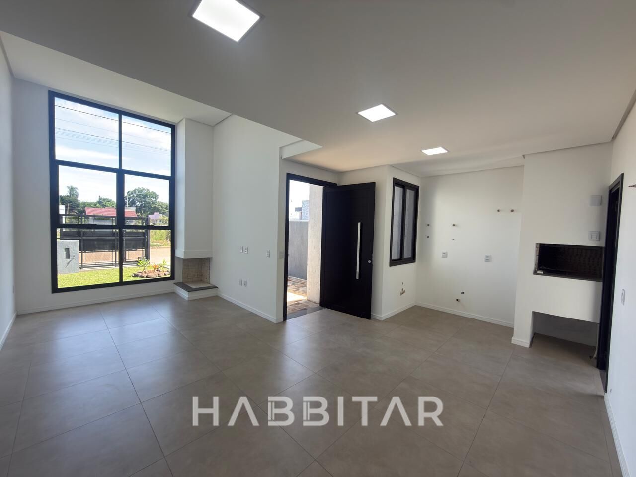 Possui dois dormitórios, sendo um deles suíte, sala de estar com pé direito alto, sala de jantar e cozinha integradas, churrasqueira, lareira, lavanderia e banheiro social. Uma vaga para veículo